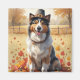 Ein Aquarellbild eines fröhlichen Hundes inmitten eines Haufen lebendiger Herbstlaub, umgeben von winzigen Kürbissen und verstreuten Eichhörnchen. Der Hund trägt einen kleinen Pilgerhut und strahlt vor Freude aus, um den Geist des Erntedanks zu erfassen. Im Hintergrund sorgen weiche Erntefelder und goldfarbene Bäume für eine friedliche Landschaft. Die sanfte Struktur und die warmen, gedämpften Herbsttöne verleihen der Szene ein gemütliches, nostalgisches Gefühl, das perfekt ist, um die Schönheit der Saison zu feiern.