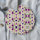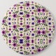 Round floral pattern button featuring a symmetrical design of purple and pink flowers with green leaves on a cream background, creating a vibrant and cheerful tone.