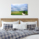 Impression paysagère en toile d'un chemin de terre sinueux "strada bianca" avec de nombreuses courbes à travers les champs verts dans un paysage en Toscane avec un arbre le long du chemin et de beaux nuages dans le ciel menant à une destination au loin. Une analogie avec votre objectif.
