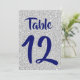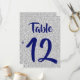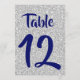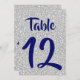 Eine elegante monogramm Hochzeitstischkarte mit königsblauen Zahlen auf einem silbernen Glitzer-Hintergrund. Der Stil, die Farbe und die Platzierung des Schriftartes können auch beliebig verändert werden.