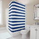 Der Duschvorhang ist blau und weiß gestrichen. Royal blau-weiß gestreiftes Muster.
