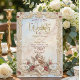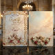 Versetzen Sie Ihre Gäste mit diesem opulenten Design in eine Welt der klassischen Romantik, mit himmlischen Motiven und aufwendigen Details für einen wahrhaft großen Anlass. Dieses Design zeigt eine digital gemalte Ölimpression eines Cherubs, der Violine spielt, vor einem himmlischen Hintergrund aus weichen blauen Wolken und Sonnenstrahlen. Das zentrale Kunstwerk ist von einem komplexen Rahmen umgeben, der den Look von geschnitztem Stein und vergoldetem Akanthus-Ornamentik simuliert. Sträuße aus staubroten und weißen Tulpen und Rosen akzentuieren die Ecken und schaffen einen reichen Kontrast zur Creme- und Pastellblaupalette. Es handelt sich um ein flaches Druckbild mit einem Faux-Goldrelief- und Steintextureffekt, nicht um tatsächliche geprägte Folie, Metall oder geschnitztes Material.