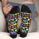 Sie sind die perfekte Socke für die Spielabend. Diese gemusterten Crews-Socken haben Abbildungen von Rollenspielwürfeln mit 12-seitigen, 20-seitigen und 4-seitigen Würfeln in hellen Farbtönen vor schwarzem Hintergrund.