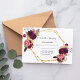 Une carte RSVP élégante avec modèles pour réponse par date, nom, etc. Plumes et roses aquarellés, fleurs en bordeaux. Un faux cadre doré et blanc. Un arrière - plan blanc devant, du texte noir.