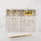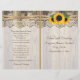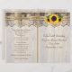 Elégante dentelle blanche, ruban, tournesol et le programme de mariage plié en bois avec dentelle blanche sur le bois avec deux rubans satinés croisés et tournesols. Texte en marron. Notez que dentelle, bois et tournesols sont tous "imprimés" et non de vrais tissus ou fleurs. Ce design élégant, sophistiqué et romantique à l'essence rustique fait partie d'un ensemble mariage et est parfait pour un pays chic ou western automne/mariage avec une palette de couleurs neutres. Vous devrez plier dans le centre pour avoir un programme plié. Choisissez seulement le type de papier de valeur comme il se plie bien.