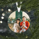 Personnalisez cet élégant ornement rond avec une photo de chaque côté pour commémorer une année spéciale. Customisez l'avant avec votre nom de famille en blanc sur une bannière festive de ruban vert d'épinette, et ajoutez l'année à l'arrière.