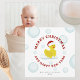 Illustration einer gelben Gummiente mit Weihnachtsmannmütze, umgeben von Blasen. Personalisieren Sie den Rücken mit dem Foto auf der Rückseite.