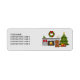 Desteis originelle Cartoon Illustration einer niedlichen rubinfarbenen Cavalier King Charles Spaniel züchten Hund. Neben dem Hund gibt es einen personalisierbaren Textbereich. Der Hund ist in einem festlichen Wohnzimmer mit Kamin untergebracht. Zwei rote Strümpfe hängen am Kamin. Auf dem Kamin befindet sich ein grüner Kranz, der mit einem roten Bogen und gelben Kreisen als Lichter dekoriert ist. Auf dem Kaminboden stehen drei kleine dreieckige Bäume, die ebenfalls mit gelben Kreisen geschmückt sind. Auf der anderen Seite des Kamins befinden sich zwei beige Kerzen. Neben dem Kamin befindet sich ein festlich grüner Weihnachtsbaum mit zwei Geschenken. Der Weihnachtsbaum ist mit roten und gelben Ornamenten und einer grauen Garage dekoriert. Auf dem Baum ist ein gelber Stern.