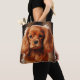 Ein nahes Porträt eines Ruby Cavalier King Charles Spaniel. Der Hund sitzt auf einem weichen, orangefarbenen Stoff mit seinen Pfoten, die schön davor liegen. Seine großen, dunklen Augen blicken direkt auf den Betrachter und vermitteln ein Gefühl von Wärme und Zuneigung. Das Fell des Hundes ist sehr detailliert und zeigt seine weiche Textur und fließende Wellen. Perfektes Geschenk für Cavalier Liebhaber.