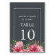 Elegante und moderne rubinrosafarbene Tischnummer mit blühender Hochzeitskarte mit bemalten Aquarellfarben-Blume in Rosa und üppigem grünem Blattwerk auf einem schicken, schwarzen Hintergrund. Fügen Sie einfach Ihre Hochzeitsdetails hinzu. Wenn Sie Hilfe oder passende Produkte benötigen, kontaktieren Sie uns bitte über unseren Shop. Wir helfen Ihnen gerne, Ihre Hochzeit zum schönsten Tag zu machen!
