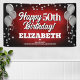 Ein lustiges Bannerzeichen für innen oder außen mit festlich silberfarbenen Metallballons auf beiden Seiten des Designs mit funkelnd, silbernen Metallkonfetti auf einem reich strukturierten rubinroten Hintergrund für Ihr personalisiertes Geburtstagsbanner. Dieses Produkt verdoppelt sich als wunderbarer Meilenstein-Geburtstagssicheres.