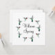 Hübsche "Welcome Spring"-Karte mit rubingebeutelten Kolibris auf weißem Hintergrund. Der rubingebeutelte Kolibri (Archilochus colubris) ist ein winziger Vogel mit smaragdgrünem Rücken, schwarzer Maske, grüner Krone und leuchtend rotem Hals. Es ist in offenen Wäldern, Waldrändern, Grasland, Wiesen und in Parks, Gärten und Hinterhöfen in der Nähe von Kolibris und röhrenförmigen Blume zu finden.