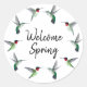 Hübsche "Welcome Spring" Aufkleber mit rubingebeutelten Kolibris auf weißem Hintergrund. Der rubingebeutelte Kolibri (Archilochus colubris) ist ein winziger Vogel mit smaragdgrünem Rücken, schwarzer Maske, grüner Krone und leuchtend rotem Hals. Es ist in offenen Wäldern, Waldrändern, Grasland, Wiesen und in Parks, Gärten und Hinterhöfen in der Nähe von Kolibris und röhrenförmigen Blume zu finden.