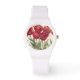 © Carol Rowan / Wilder Apple. Ein Haufen rubinfarbener Tulpen mit Blätter und Stielen. Das Bild hat einen schlichten, weißen Hintergrund.