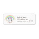 Auf dem Adressetikett stehen Regenbogen, Sterne und Einhorn.