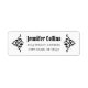 Rücksende-Aufkleber. Name und Adresse werden zwischen einem Paar eleganter Jugendstil-Ornamente platziert. Die Ornamente sind svg-Dateien, was bedeutet, dass Sie die schwarze Farbe in jede gewollt Farbe ändern können. Die Standard-Schriftart sind Pirata One für den Namen und Cormorant SC für die Adresse.