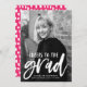 Stilvolle, moderne Graduierungsankündigungen mit dem senkrechten Foto des Absolventen mit "Cheers to the grad" in einem weißen, handgeschriebenen Pinselskript. Personalisieren Sie die Vorderseite der Ankündigung, indem Sie den Namen des Absolventen, den Schulnamen und das Abschluss Jahr. Die Ankündigung des Foto Abschlusses kehrt zurück, um ein abstraktes Punktmuster in Rosa und Weiß anzuzeigen.