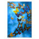 Viele farbenfrohe Schmetterlinge fliegen zusammen über einen weichen blauen Hintergrund von Wolken in einer Kurve.