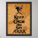 Parodie der beliebten behalt Ruhe und weiter Zitat, aber für Pirates! Behalt Ruhe und sag ARRR. Piratenschädel und gekreuzte Schwerter mit einer Vintagen Piratenkarte des Florida Keys Hintergrunds.