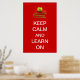 Dieses Poster hat einen roten Hintergrund, mit einem Bild eines grünen Apfels auf drei roten Büchern, und einem weißen Text mit dem Titel "Behalt Ruhe und lerne On".