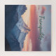 Hübsche Aussicht auf einen Berggipfel mit Schnee mit schönen rosa und lila Wolken mit dem Wort Ruhe.