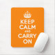 Behalten Sie Ruhe und Carry On Vintag-Style-Design vor einem hellen Regenbogen-Orange-Hintergrund.