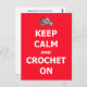 Eine Postkarte von "Behalt ruhig und crochet on", rot und mit einem schwarz-weißen Tuch aus Wolle und zwei roten Häkelhaken dekoriert.