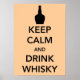 Behalt Calm und Drink Whisky Poster in Schwarz mit einem bräunlichen Hintergrund.
