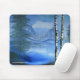 Mousepad mit einem Bild von Dawn K. Williams' traditionellem Gemälde "Tranquil Lake", einer blauen und grünen Landschaft mit Birken- und Kiefernbäumen, Hügeln und einem reflektierenden See.