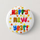 Ein Neujahrsknopf oder ein Abzeichen mit "Happy New Year" in bunten Buchstaben und orange und gelb beginnt überall auf dem weißen Hintergrund verstreut. Von Judy Adamson entwarf eine handbemalte Collage.