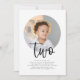 Eine moderne zweite Geburtstagseinladung mit einem runden Foto und dem Wort "Zwei" in einem kalligraphischen Schriftart, perfekt für das 2. Geburtstag Ihres kleinen Party!
