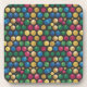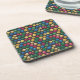 Dieser Untersetzer zeigt farbenfrohe Kreise in einer rasterähnlichen Formation auf schwarzem Hintergrund. Die Kreise sind abwechselnd in Reihen angeordnet, mit einem Farbverlauf von hellgrün, blau, rosa, metallisch gold und gelb. Jeder Kreis hat ein glänzendes, dreidimensionales Erscheinungsbild mit Schatten und Schatten. Das Muster erzeugt ein sich wiederholendes geometrisches Design, das sich über den Rahmen hinaus auf allen Seiten erstreckt. Die Kreise haben eine glatte, polierte Oberflächenstruktur, die Licht reflektiert und ihnen eine dimensionale Qualität verleiht. Der Untersetzer ist ein quadratischer Untersetzer aus Kunststoff, der mit einem Korkunterteil ohne Skiküre versehen ist. Im Untersetzer Set sind sechs Untersetzer aus Kunststoff.
