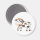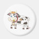 Ein runder Kühlschrank Magnet mit der Abbildung einer weißen und schwarzen Schweizer Kuh, die um ihren Hals eine Schweizer Kuh trägt und auf einer gelben wilden Blume kaut. © ArianeC Illustrationen