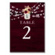 Elégant, rustique, moderne boho, marsala burgundy numéro de table de mariage avec de belles fleurs d'aquarelle en monogramme de bocal de mason et lumières à cordes.