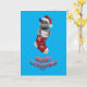 Eine russische Blaukatze trägt eine Weihnachtsmannmütze und hält sich aus einem Weihnachtskater heraus.