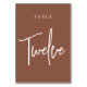 Einfache und schicke Tischnummer-Karten im Erdton Rost braun und Weiß machen eine elegante Aussage bei Ihrer Hochzeit oder Veranstaltung. Das Design bietet "table [number]" in einem spannenden Mix aus klassischen Serifen und handgeschriebenen Skripten. Design wiederholt sich auf beiden Seiten. Einzelne nummerierte Karten werden separat verkauft; bestellen Sie jede Tischnummer einzeln aus unserer Sammlung.