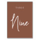 Einfache und schicke Tischnummer-Karten im Erdton Rost braun und Weiß machen eine elegante Aussage bei Ihrer Hochzeit oder Veranstaltung. Das Design bietet "table [number]" in einem spannenden Mix aus klassischen Serifen und handgeschriebenen Skripten. Design wiederholt sich auf beiden Seiten. Einzelne nummerierte Karten werden separat verkauft; bestellen Sie jede Tischnummer einzeln aus unserer Sammlung.