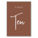 Einfache und schicke Tischnummer-Karten im Erdton Rost braun und Weiß machen eine elegante Aussage bei Ihrer Hochzeit oder Veranstaltung. Das Design bietet "table [number]" in einem spannenden Mix aus klassischen Serifen und handgeschriebenen Skripten. Design wiederholt sich auf beiden Seiten. Einzelne nummerierte Karten werden separat verkauft; bestellen Sie jede Tischnummer einzeln aus unserer Sammlung.