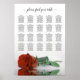 Dieses elegante 20-Tisch-Hochzeitsdiagramm zeichnet sich durch eine wunderschöne rostorange oder gebrannte, bunte Rose aus, die in Wasser mit Wellen und Wellen reflektiert. Der Titel lautet "Bitte finden Sie Ihren Tisch" in laky Skriptkalligrafie. Es gibt Platz für die Namen des Paares und das Hochzeitstag. Dieses Diagramm enthält Tischbelegungen für 200 Gäste - 10 Personen pro Tisch.