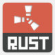 RUST Symbol in Clear auf einem roten Hintergrund, weißes RUST auf schwarz.