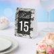 Elegant wedding table number featuring modern typography against a rustic birch bark background.