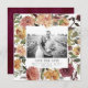Unsere Rustic Bloom Save the Date-Karte in einem einzigartigen quadratischen Format umrahmt Ihr Lieblings-Verlobung-Foto mit einer Grenze von lackierten Aquarellfarben-Blume in üppigen Herbsttönen aus Rot, Bordeaux und Marsala mit dunkelgrünem Blattwerk. Personalisieren Sie mit Ihren Namen, Hochzeitsdatum und Ort mit den angegebenen Feldern.