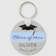 Moderne Rustikale Blaue Klasse der Abschluss Schlüsselanhänger mit einem Graduiertennamen, Schulname, Klassenjahr und schwarzen Graduiertenmütze. Blauer Streifen auf grauem rustikalem Hintergrund. Personalisieren Sie den Schlüsselanhänger und machen Sie ein großartiges personalisiertes Geschenk und halten Sie für einen Absolvent.