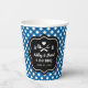 Hochzeitspapier-Party-Becher sind mit einem marineblauen Gingham-karierten gemusterten Hintergrund mit Schwarz-Weiß-Grill-Design mit GRILLEN Gabel und Spatula Grill-Utensilien und einem Herzinfarkt ausgestattet. Personalisieren Sie den benutzerdefinierten Text mit den Monogramm-Initialen des Paares, den Namen, dem Wortlaut der DO-GRILLEN und dem Datum. Ideal für eine lässige Hochzeitsfeier im Hinterhof.