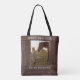 This rustic tote bag features your own photo surrounded by graphics that look like a dark brown wood frame. NOT A REAL FRAME. Works best with 3x4 photos. Add text at top and bottom for the location, year, and names of people in the picture. ••• For more creative photo frames, visit my store Zazzle.com/DriftwoodAndDreams ••• For custom orders, message me on Zazzle