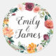 Auf dem Aufkleber der Gastgeschenk Hochzeit befindet sich ein stylisches Skript-Monogramm der Braut- und Bräutigamen, gerahmt von einem rustikalen Blumenkranz mit wunderschönen Rose im Sommer und Herbst, Dahlien, peony Blume und Grünpflanzen, in einer herrlichen Herbstpalette aus bordeauxrot, goldgelb, pfirsichfarben, rot und grün.