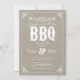 Design d'invitation de soirée barbecue vintage moderne avec une typographie rustique élégante et en mauvais état et une bordure pointillée mignonne avec des détails vintages du coin de défilement sur un arrière - plan imprimé faux burlap texture toile. Cliquez sur le bouton CUSTOMISER IT pour customiser les polices, déplacer du texte et créer votre propre conception unique d'invitation unique.