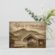 Rustic Country Cabine Mountain Wedding Invitations avec un style rustique brun déprimé antique scène de campagne d'un vieux cabine au premier plan et un pré ou champ et montagnes dans l'arrière - plan. Ils sont parfaits pour les mariages campagnards en plein air, les mariages agricoles, les mariages de ranch, et pour toute personne qui veut une invitation de mariage campagnard rustique.