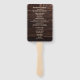 Hochzeitsfeierprogramm/Zeremoniell von Hand-Fans in einem rustikalen dunkelbraunen Holz mit cremefarbenem Text. Dazu gehören das Zeremoniell, die Namen der Eltern der Braut und des Bräutigams, der Beamte, des Brautparty und anderer Teilnehmer. Kontaktieren Sie uns für Hilfe bei der Anpassung oder der Anpassung von Produkten.