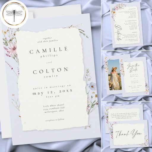 This dusty blue floral wedding save the date card features a soft pastel background, delicate wildflowers, and a handmade torn edge paper look. Perfect for romantic garden weddings, it offers an elegant, modern style with timeless charm for couples seeking a refined wedding design. Created by Simply Farmhouse Press.